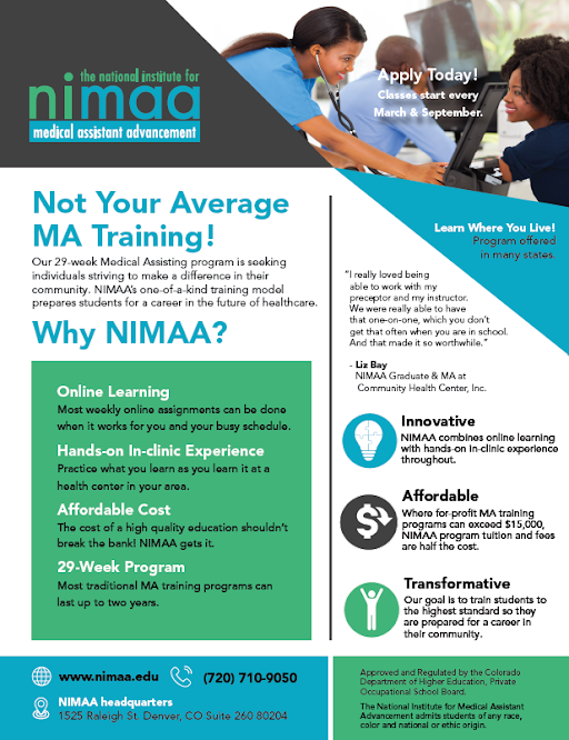 Hamdard Health Alliance is incredibly proud to be partnering with the National Institute for Medical Assistant Advancement (NIMAA), a recognized medical assistant training program, to provide training opportunities to meet the needs of our community members.